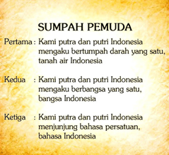 다종족 국가인 인도네시아가 하나된 민족의식을 갖게 된 계기는 1928년 바타비아에서 있었던 ‘청년의 맹세’ 즉 ‘숨빠 뻐무다(Sumpah Pemuda)’ 였습니다. 이 선언에서 인도네시아인들은 “하나의 조국-인도네시아, 하나의 민족-인도네시아 민족, 하나의 언어- 인도네시아어”를 채택했습니다.