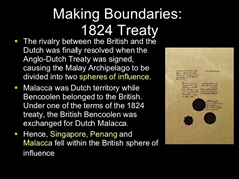 19세기초에 네덜란드는 240만명의 적은 인구로 인도네시아와 전세계 기지들을 통치해야 했습니다. 1824년에 영국과 네덜란드는 서로 관심 영역을 규정하는 ‘런던조약(Treaty of London)’을 체결했습니다. 영국은 자신의 영역에 말레이 반도와 싱가포르를 포함시켰고, 네덜란드는 인도네시아에 대한 지배를 다시 확립했습니다.